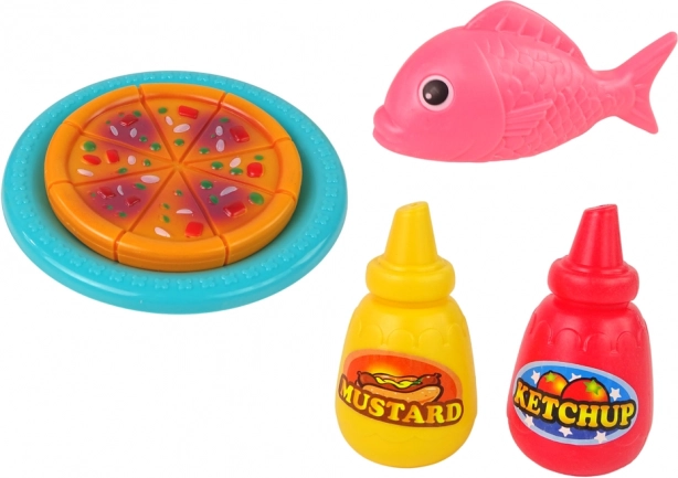 Součástí balení jsou plastové hračky jako ryba, kuře a pizza, které zvyšují možnosti hry.