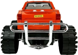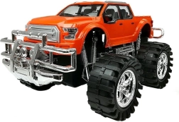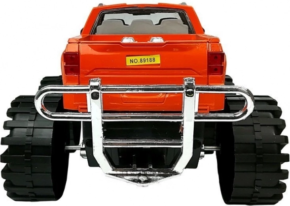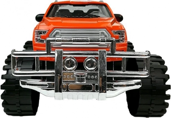 Oranžový truck s výrazným odpružením, chromovanou maskou a robustní konstrukcí pro hraní doma i venku.