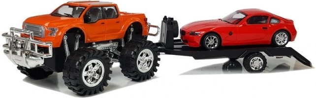 Objevte dokonalou sadu pro malé milovníky aut: oranžový monster truck s velkými koly, odtahový přívěs a červené sportovní auto. Robustní plastová konstrukce zaručuje odolnost a dlouhou životnost, zatímco kombinace terénního trucku a přívěsu nabízí akční a kreativní hraní doma i venku.