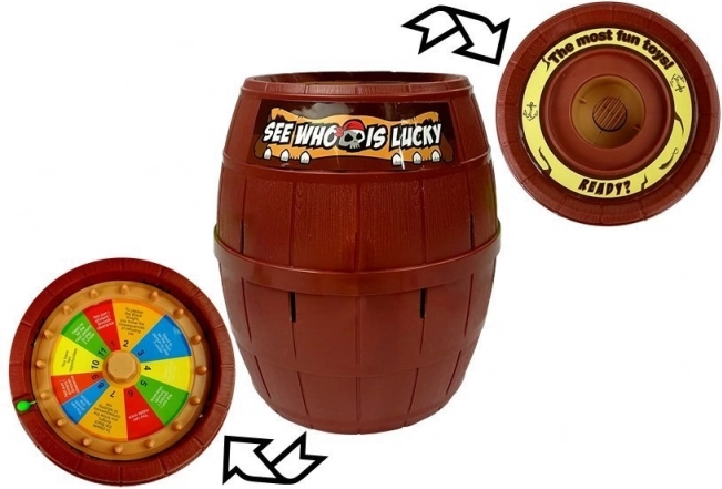 - Pirát, sud s otvory, 16 barevných mečíků, kotouč štěstí s barvami