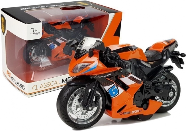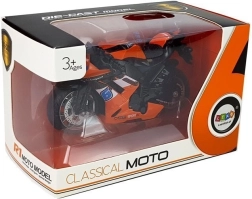 Motocykl je zabalen v transparentní krabici s nápisem 'Classical Moto', což jej činí ideálním dárkem.