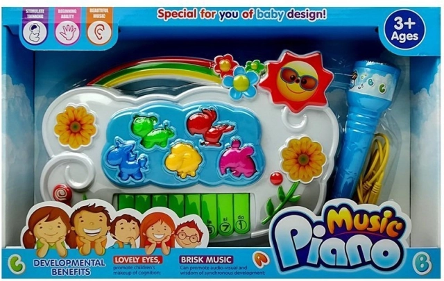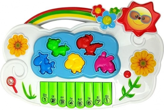 Součástí piana je 8 kláves a pět zvířecích prvků (kočka, papoušek, kůň, ovečka, slon), které se vkládají na správné pozice – skvělá forma zábavy i tréninku jemné motoriky. Hračka nabízí volbu 2 jazyků (angličtina, španělština) pro hravou výuku slovíček a zvuků.