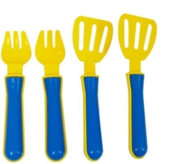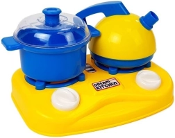 - kuchyňský sporák, kuchyňská váha, prkénko, 4 šálky s podšálky, konvička, solnička, rendlík, hrnec, pánev se dvěma úchyty, 3 pokličky, talířek, košík, kelímek, příbory (2 nože, 2 vidličky, 1 lžíce), 2 obracečky, potraviny (párečky, vajíčko, banán se suchým zipem, kukuřice se suchým zipem, jahoda se suchým zipem, houba se suchým zipem, mrkev, citron, oříšek), lahvičky (kečup, olej, 2 omáčky)