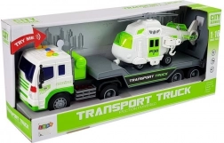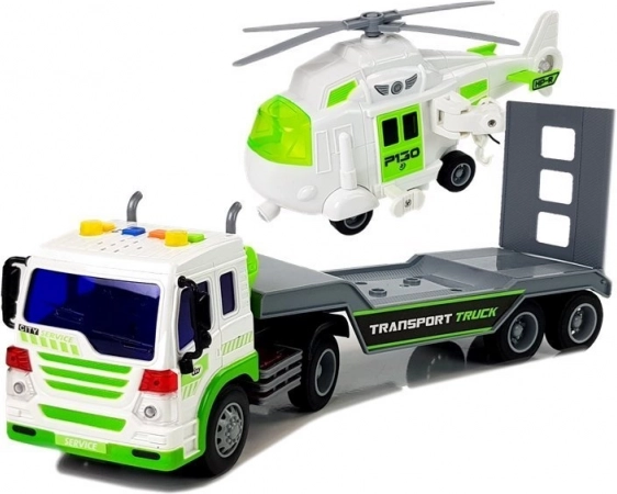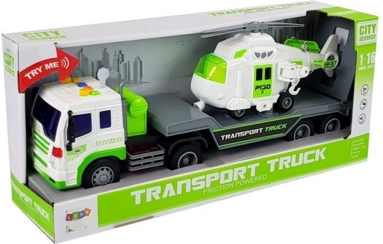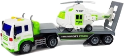 Tento detailně zpracovaný přepravní kamion v bílo‑zeleném provedení má dlouhou plošinu pro pohodlné naložení vrtulníku či dalších vozidel. Zadní sklopná rampa usnadní nájezd a bezpečné upevnění nákladu. O zábavu se postarají světelné a zvukové efekty – na střeše kabiny najdete 4 tlačítka pro start motoru, klakson, zvuk jízdy i couvání. Díky frikčnímu pohonu stačí auto natáhnout dozadu a pustit.