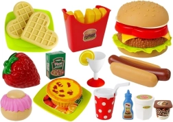 Set obsahuje rozličné potraviny jako hot dog, hranolky, gofry a mnoho dalšího. Všechny položky jsou vyrobeny z bezpečného a odolného plastu, vhodného pro děti starší tří let a certifikované CE standardem. Rozměry dílů se pohybují od 7 cm u hranolek po 12 cm u kokosového džusu, což je ideální pro malé dětské ruce.