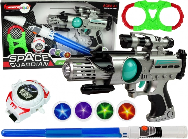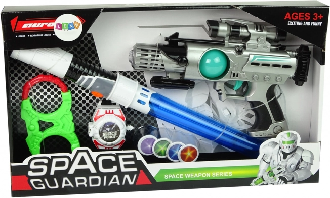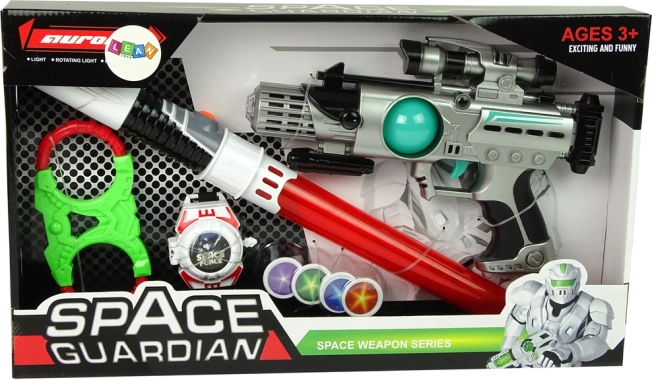 Sada vesmírných zbraní Space Guardian je kompletní balíček pro všechny malé dobrodruhy. Je vybavena nejen laserovou pistolí, ale také světelným mečem, play kámpy a vystřelovačem disků pro komplexní herní zážitek. Díky světelným a zvukovým efektům je hra s touto sadou poutavější a kreativnější.