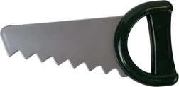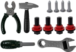 Pila, kladivo, kleště, šroubovák, klíč, šrouby, matice a destičky ke šroubování – vše z odolného plastu bez ostrých hran.