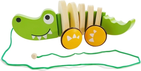 Přátelský zelený krokodýl s hladkým dřevěným povrchem a oranžovými kolečky je ideální parťák na procházky po bytě. Při tažení se jeho tělo vlní a dělá hru ještě zábavnější.