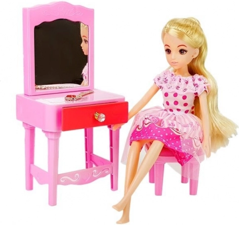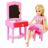 Růžová toaletka se zrcadlem a stoličkou umožní vytvářet účesy a připravit panenku na každý den.