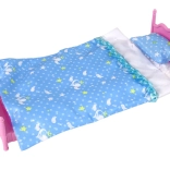 Růžová postel s modrou dekou s hvězdičkami a polštářkem zajistí panence pohodlný spánek a realistické scénky před spaním.