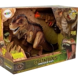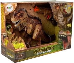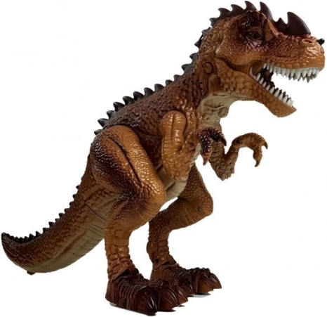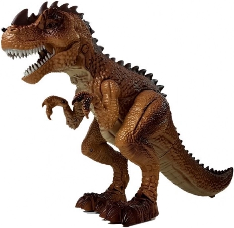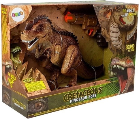 Interaktivní dinosaurus potěší všechny fanoušky pravěku i akčních příběhů. Po zapnutí se sám pohybuje vpřed, zní kroky a děsivý řev a oči se rozsvítí červeně. Stisknutím spouště na pistolí odstartujete souboj – každý zásah spustí světelné a zvukové efekty; při devátém trefení se T‑rex porazí a vydá efekt prohry.