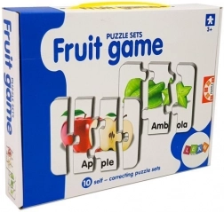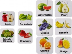 Každý dílek zobrazuje ovoce a jeho název v angličtině (např. Apple, Banana, Orange). Děti si slovíčka zapamatují díky spojení obrazu a textu.