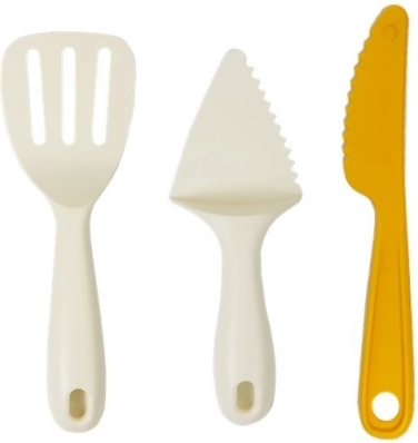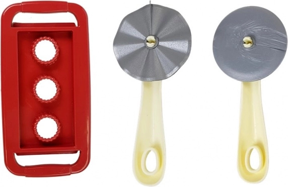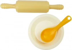 Sada obsahuje váleček, lžíci, špachtli, nůž na servírování a misku – vše pro realistickou hru v dětské kuchyňce.