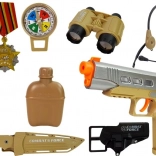 Kompletní dětská vojenská sada pro malé průzkumníky přináší spoustu akční zábavy a rozvoje fantazie. Obsahuje vše potřebné pro napínavé mise – svítící a zvukovou pistoli, lornetku, krátkovlnnou vysílačku, kompas, headset s mikrofonem, nůž s pouzdrem a další doplňky. Vše je vyrobeno z kvalitního plastu, má certifikaci CE a je vhodné pro děti od 3 let.