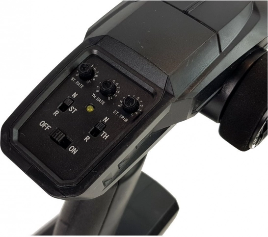 Ergonomický vysílač umožňuje plynulou regulaci plynu, nastavení úhlu zatáčení i limitu rychlosti. Bez rušení, ideální pro společné závody.