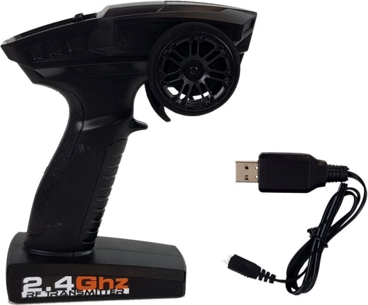- RC auto, vysílač 2,4 GHz, akumulátor 7,4 V, USB nabíječka, návod (EN)