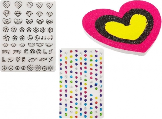 Sada obsahuje barevné nálepky a pěnové tvary, které umožňují vytvořit unikátní nehtový design.
