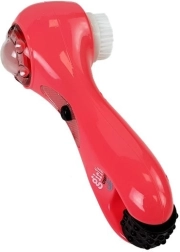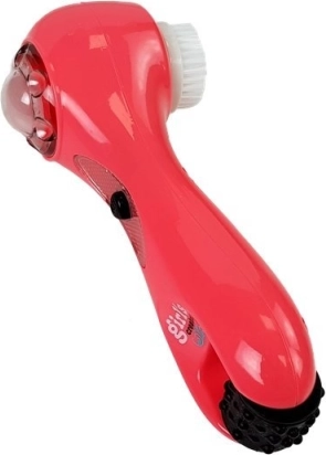 Červený ruční masér s kartáčovou nástavbou a masážními hlavicemi pro osobní péči.