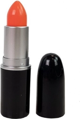 Krásně balená rtěnka v korálovém odstínu v černém pouzdru se stříbrným proužkem.