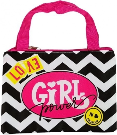 Malá taštička s černo-bílým cikcak vzorem a růžovým nápisem 'Girl Power'.