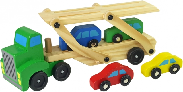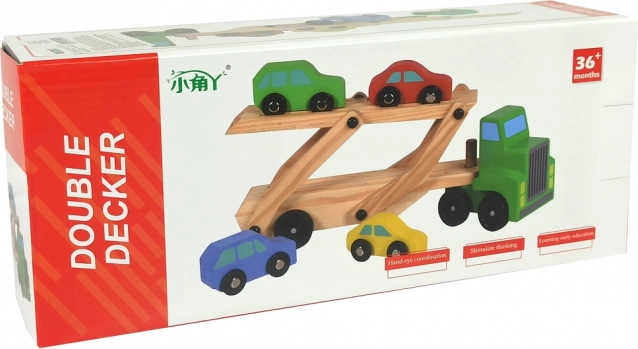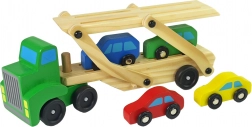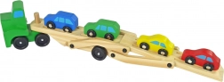 Tato dřevěná odtahová souprava potěší každého malého fanouška motorizmu. Sestava obsahuje robustní nákladní vozidlo s dvoupatrovou odtahovou plošinou a 4 barevná autíčka. Díky sklopné (rozkládací) rampě mohou autíčka snadno najet na plošinu a bezpečně se přepravovat.
