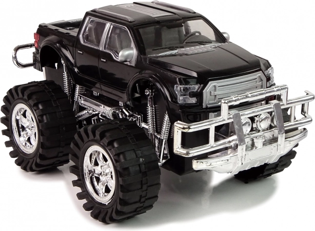 Robustní černý truck s vysokým podvozkem a velkými pneumatikami hladce přejíždí nerovnosti a je připravený na každodenní dobrodružství.