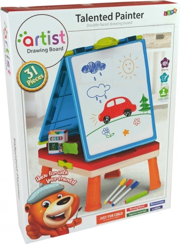 Tabule má dvě povrchy - bílou pro zmazatelné fixy a černou pro křídové kreslení. Součástí je sada fixů v pěti barvách a 12 kusů křídy. Navíc získáte kostku a figurky pro deskové hry jako jsou Člověče, nezlob se a Hadi a žebříky.