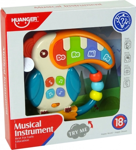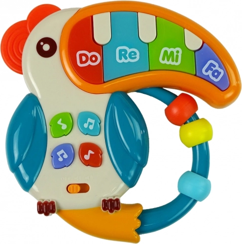 Hudební pianko ve tvaru papouška je ideální pro rozvoj dětských smyslů. Díky 5 barevným klávesám DO RE MI FA s efekty světel si děti mohou vychutnat různé melodie a zvukové efekty, což posiluje jejich schopnost rozlišovat zvuky. Malé tlačítka ve tvaru not aktivují další funkce, jako jsou různé zvuky a melodie.