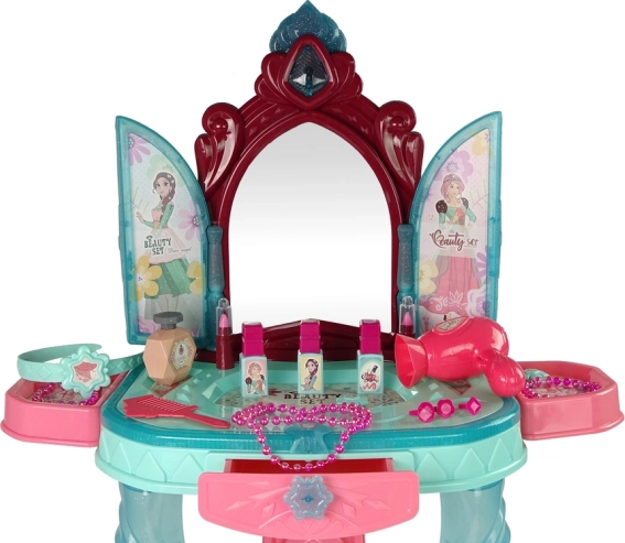 Obsahuje rozmanité kosmetické doplňky: součásti pro sestavení toaletky, nálepky, fén na vlasy, hřeben, laky na nehty, prstýnky, náramky, náhrdelník, vlasové sponky, vůni, rtěnky a židličku. Toaletka má pastelové barvy, které snadno zapadnou do každého dětského pokoje.