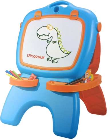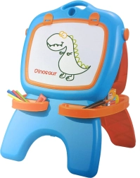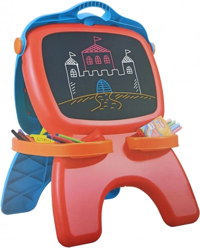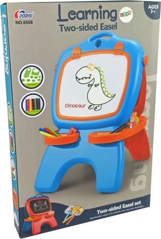 Oboustranná magnetická a křídová tabule pro malé umělce i školáky nabídne bílou plochu pro suché mazání a černou plochu pro kreslení křídou. V balení najdete 12 fixů, 12 kříd, šablony písmen a tvarů, praktické šuplíky na doplňky a háček na uchycení papíru. Podporuje kreativitu, jemnou motoriku a koordinaci oko–ruka.