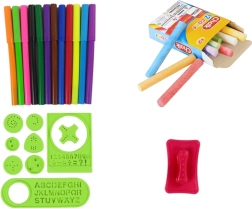 - 12 barevných fixů, 12 barevných kříd, šablona s geometrickými tvary, šablona s písmeny, svítící fix, háček na papír, úložné šuplíky