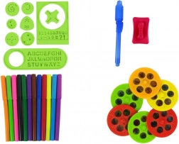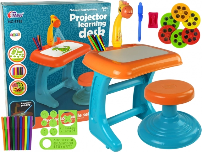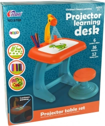 Součástí sady je také malá stolička, se kterou se vaše dítě bude moci pohodlně posadit ke stolu. Sedátko i stolička jsou v růžových barvách, budou dokonalým doplňkem výzdoby dětského pokoje. V horní části stolku jsou dvě malé zásuvky, do kterých můžete schovat psací potřeby v celé škále barev, budou tak vždy na dosah. Projektor uprostřed stolku připomíná přátelskou žirafu. Zobrazuje nejrůznější obrázky se zvířátky a postavičkami, které lze nakreslit na list papíru. Šablony v sadě naučí vaše dítě správné názvy geometrických útvarů a psaní písmen.
