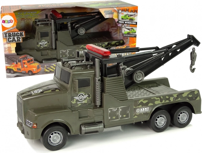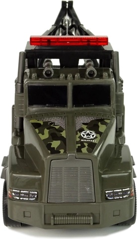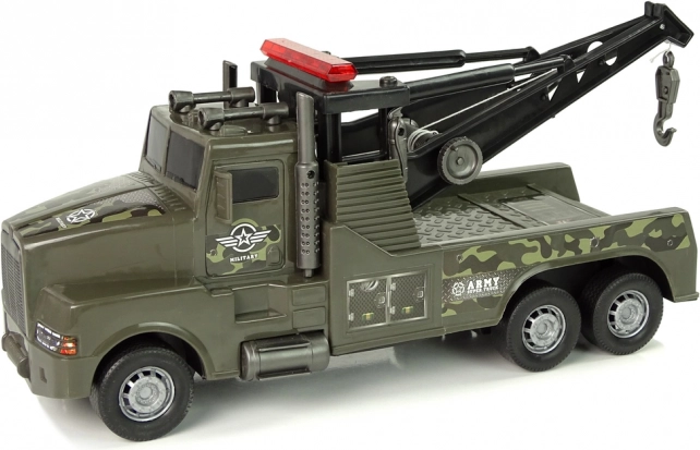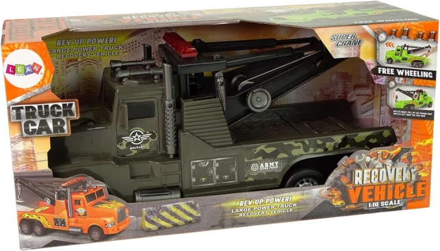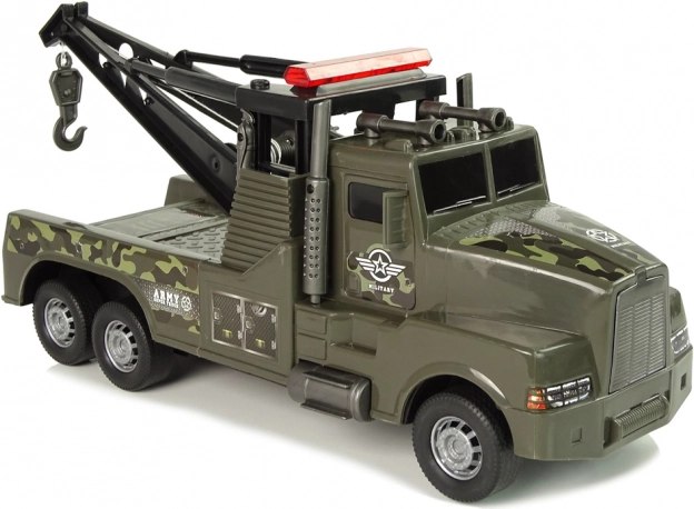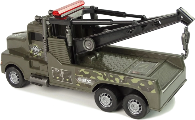 Tento plastový odtahový vůz s maskovacím potiskem a vojenskými nálepkami nadchne všechny děti, které milují akční a záchranné mise. V zadní části je umístěn jeřáb s navijákem, který se vysouvá pomocí boční kličky, na konci s pevnostním hákem pro snadné připevnění jiné hračky.