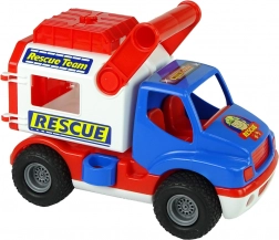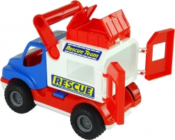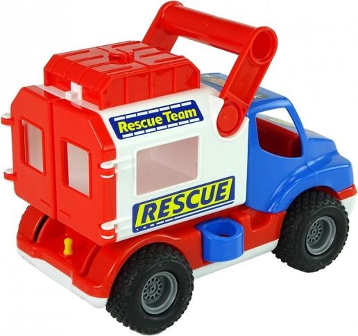 Vůz je vybaven gumovými koly s protiskluzovým vzorem pro hladkou jízdu, má otevírací zadní červené dveře i horní schránku na drobnosti. Boční pojistka udržuje nástavbu stabilní – po uvolnění se nástavba stává mobilní a páčkou ji lze vyklopit dozadu. Samolepky s motivem „Rescue/Rescue Team“ podporují tematickou hru.