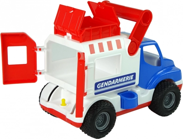 Robustní autíčko žandarmerie pro nejmenší od 1 roku přináší hodiny zábavy i učení. Díky gumovým kolům s běhounem má lepší přilnavost, nabízí otevírací zadní dveře a horní schránku na poklady a figurky a stabilní návěs s pojistkou pro bezpečné hraní. Kvalitní zpracování s certifikátem CE zaručuje odolnost a bezpečnost.