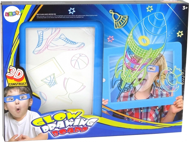 Magická podsvícená tabule je ideální pro první krůčky v kreslení i psaní. Průhledný panel s LED efekty rozzáří každý tah a po stisku tlačítka vykouzlí různé světelné režimy. Stačí vložit šablonu, obkreslit obrysy fluorescenčními fixy a nasadit 3D brýle – obrázky se rázem promění v působivou 3D podívanou.