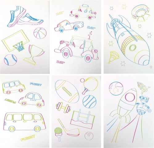 V balení najdete 4 neonové fixy, čisticí hadřík a oboustranné šablony pro snadné obkreslování a rychlý start.