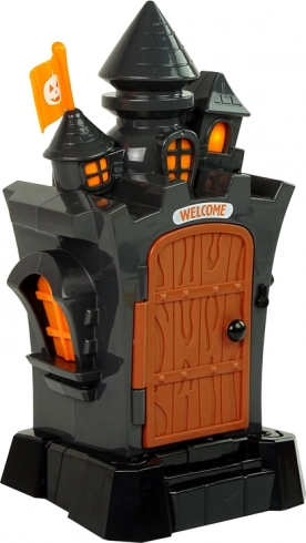 Okny domku probleskují oranžová světla, zatímco se ozývá tikání, skřípání i smích čarodějnice – ideální pro autentickou halloweenskou náladu.