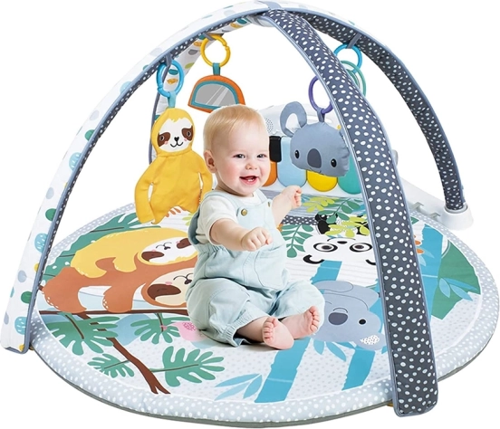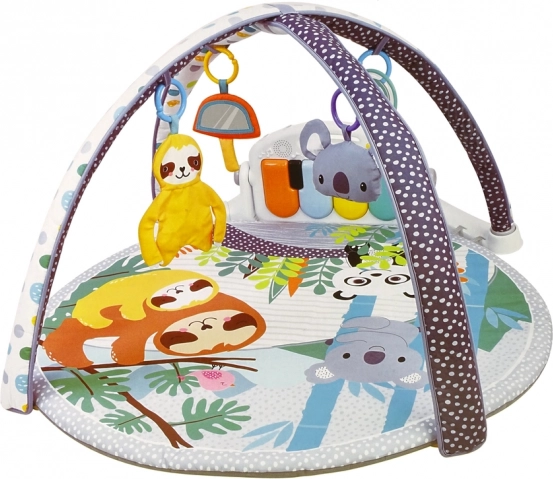 Tato měkká a bezpečná edukační podložka s motivem džungle nabídne miminku inspirativní prostor pro každodenní objevování. Barevné závěsné hračky (koala, lenochod, chrastítka) a odrazový panel fungující jako zrcátko přirozeně motivují dítě k natahování, úchopu a otáčení. Součástí je odnímatelné pianínko se svítícími klávesami, které po stisku vydávají tóny a melodie – ideální pro rozvoj sluchu a smyslu pro rytmus.