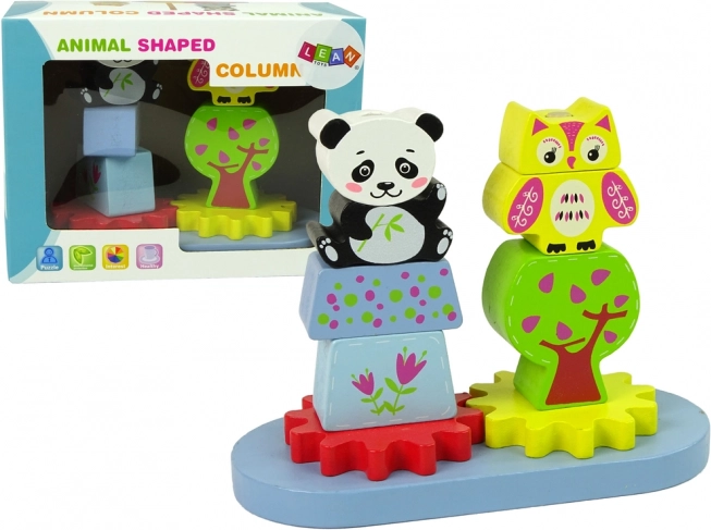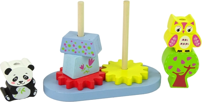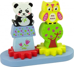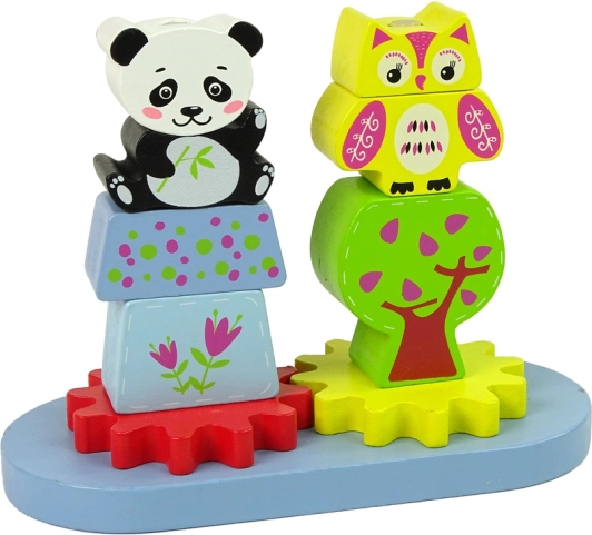 Tento fantastický dřevěný set se skládá ze základny s kostkami různých tvarů a velikostí, které představují zvířata jako pandu a sovu. Obsahuje také dvě ozubená kola, která přidávají pohyb do hry. Tyto kostky jsou ideální pro rozvoj manuálních a precizních dovedností malých dětí, když je umisťují na vystupující paže.