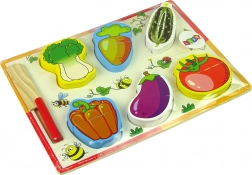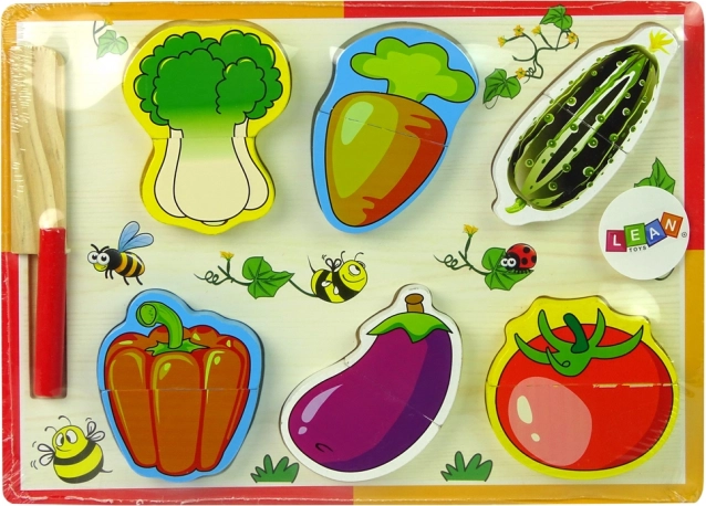 Tato barevná dřevěná sada zeleniny je rozdělena na poloviny a spojena tak, aby šla snadno „krájet“ přiloženým nožíkem na prkénku. Díky tvarovým prohlubním na prkénku si děti procvičí koordinaci oko–ruka a učení správného přiřazování tvarů. Hra na kuchaře podporuje kreativitu, rolové hry i zdravé stravovací návyky.