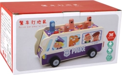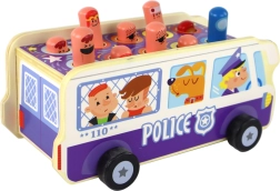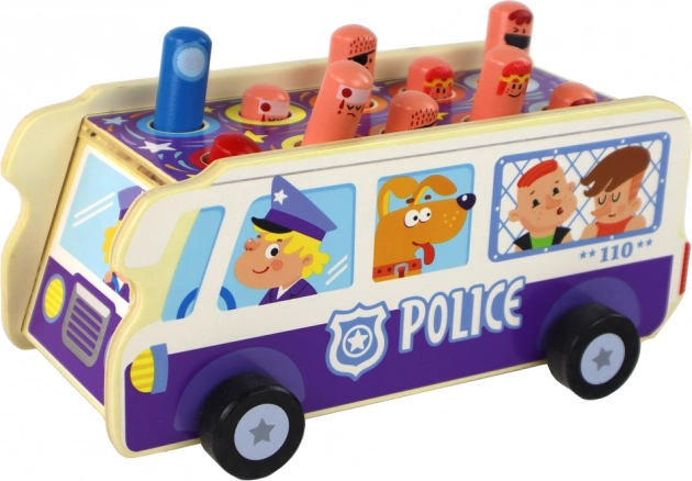 Policejní autobus z masivního dřeva spojuje tradiční „zbiják“ s jízdou na kolečkách. Děti kladívky trefují vysouvající se kolíčky–postavičky a trénují přesnost, soustředění i postřeh. Odolné zpracování a hravé ilustrace lákají k opakované hře a podporují fantazii.