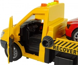 Postavte se do role malého záchranáře silnic. Odtahovka má otevírací dveře, zvedací rampu ovládanou kolečkem a výsuvnou návěsovou část s hákem pro snadné připojení a vytažení autíčka. Integrované světelné a zvukové efekty (klakson, vytažení s alarmem, couvání) dodají hře na autenticitě.