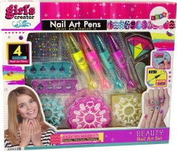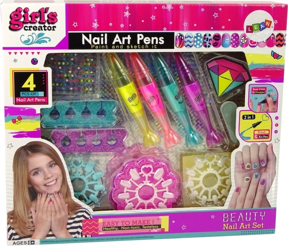 Rozvíjejte kreativitu vašich dětí s touto sadou na lakování nehtů. Dívky si mohou užít bezpečnou a zábavnou činnost, která rozvíjí jejich fantazii a preciznost při zdobení vlastních nehtů. Sada zahrnuje různé dekorační prvky, jako jsou barevné nálepky a třpytivé separátory, které přidají originalitu a styl. Děvčata mohou praxi zdobení začít na přiložených vzornících nebo rovnou na vlastních nehtech.