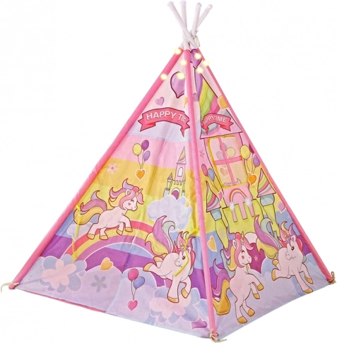 Stan se snadno skládá a poskytuje dětem prostor pro zábavu nebo odpočinek po náročném dni. Jeho střechu zdobí motivy veselých jednorožců a barevných hradů, které podporují dětskou fantazii.