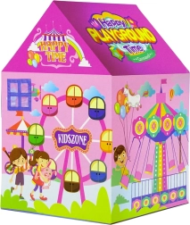 Stan Domeček Veselé Městečko je perfektním místem pro dětské hry i odpočinek. Jednoduchá a rychlá montáž umožňuje snadnou instalaci kdekoliv. Stan s motivy lunaparku, jako je ruské kolo, houpačky a kolotoče, láká k nezapomenutelným hrám.