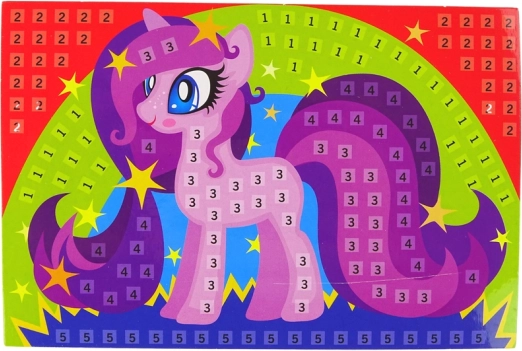 Obrázek s pony a číslovanými plochami pro snadné použití při skládání barevných čtverečků.