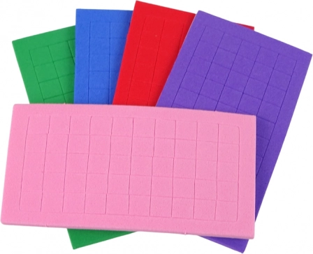 Sada obsahuje barevné pěnové čtverečky v pěti různých barvách: růžové, fialové, modré, červené a zelené.