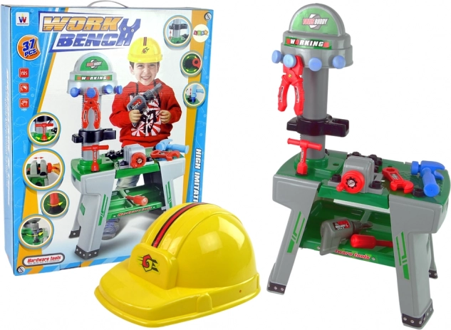 Součástí je robustní pracovní stůl a široká škála nástrojů: pilka, kladivo, šroubováky, imadlo, šrouby s matičkami, kleště, ozubená kola, helma a další prvky pro nekonečné scénáře hry. Bezpečné zpracování a trvanlivé materiály zaručí dlouhou a bezstarostnou zábavu.