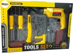 V sadě najdete vše potřebné pro šroubování, vrtání i „řezání“ – od vrtačky a pilky po kladivo, kleště a různé šroubky s podložkami a matičkami. Žluté provedení přitahuje pozornost a rozvíjí zrakové vnímání, zatímco hraní na profíka rozvíjí jemnou motoriku, koordinaci oko–ruka i kreativitu.